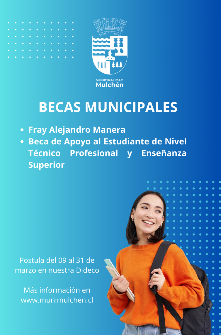 La Municipalidad de Mulchén, a través de su Dirección de Desarrollo Comunitario, hace un llamado a postular a las becas estudiantiles, las cuales buscan beneficiar a quienes se desempeñan en la Enseñanza Superior y Técnico Profesional.