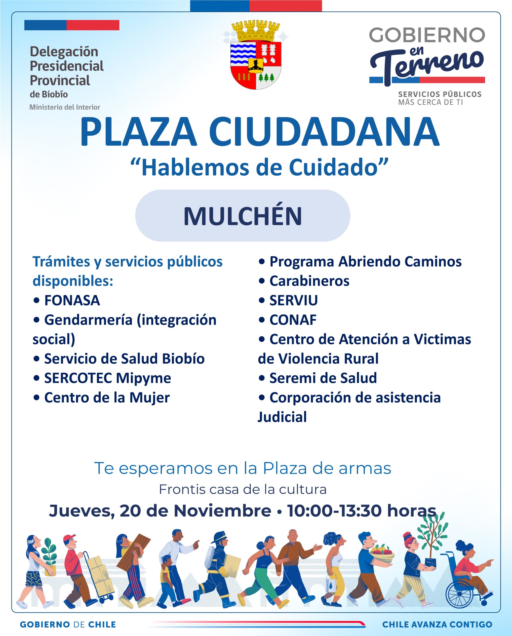 La Delegación Presidencial Provincial de Biobío, junto con el municipio, invitan a la comunidad a participar de la “Plaza Ciudadana: Hablemos de Cuidado”, un operativo de servicios públicos y municipales que se realizará en Mulchén.